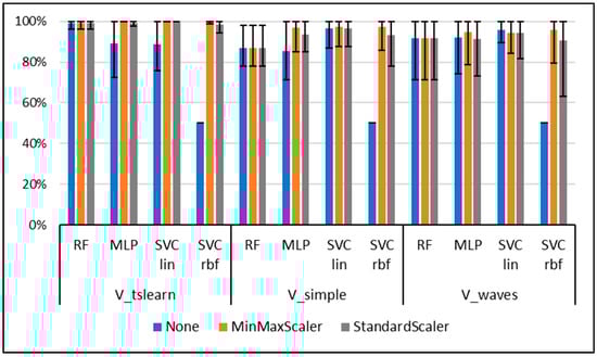 Classification results are presented in Figure 1. The overall best accuracy was obtained for the use of the V_tsfresh input vector, SVM linear (MinMaxScaler, StandardScaler), and MLP (MinMaxScaler) (mean accuracy Macc = 100%). The best result for the waveform data V_waves was obtained with SVM linear without normalization (Macc = 95.88%). SVM linear with MinMaxScaler performed best for the gait-specific data (Macc = 97.38%). The best performing models are used in the following subsections for interpretation.