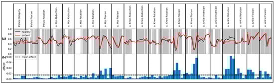 (iii) Finally, LIME results are discussed taking into account previous research. Overall, a ground truth of the automatically determined explanations is missing, and it therefore becomes more difficult to evaluate if the results are meaningful and appropriately map gait characteristics. In the literature, gait patterns of patients with THA are mostly described using simple descriptive statistics comparable with the V_simple input vector [36,46,47]. Consequently, it is harder to directly compare the effects respective to the determined relevant regions regarding the waveform data (V wave) with previous works. Further, it is not possible to evaluate all our findings with previous research because the literature often focuses on a few gait characteristics to describe group differences. In agreement with our findings, previous research reports a reduced ROM for knee and hip movement of the operated side in the sagittal plane compared with healthy subjects [36,44,46,47,48]. Further, altered postoperative ankle rotation [46] and increased sagittal pelvic movement compared with healthy subjects was found [46,47].
