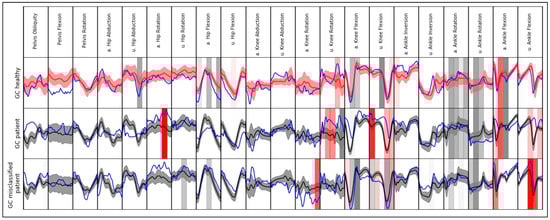 Figure 3. Exemplary local model interpretation for single gait cycle (GC) (instance) of a patient with THA, a healthy subject, and a GC of a patient classified as healthy (blue lines). The instances are plotted against the mean value and standard deviation of the other class (black = healthy, red = patient). For better visualization, the top 20 slices with the highest absolute effect are displayed for each instance (grey vertical span = effect towards class of healthy subjects, red vertical span = effect towards class of patients with THA). The color saturation indicates the effect size. For visualization reasons, data are separately scaled to a range from 0 to 1 for each variable. Abbreviations: a. = affected side; u. = unaffected side.