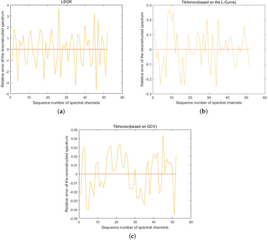 Reconstruction of the spectrum by the algorithm when the modulation function R calibrates the standard deviation to 1%. (a) The spectral accuracy recovered using the least squares (LSQR) method reached a maximum error of 400%. (b) The maximum error in spectral accuracy recovered using the Tikhonov method based on the L-curve reached 28%. (c) The maximum error in spectral accuracy recovered using the generalized cross-validation (GCV)-based Tikhonov method was only 5%.