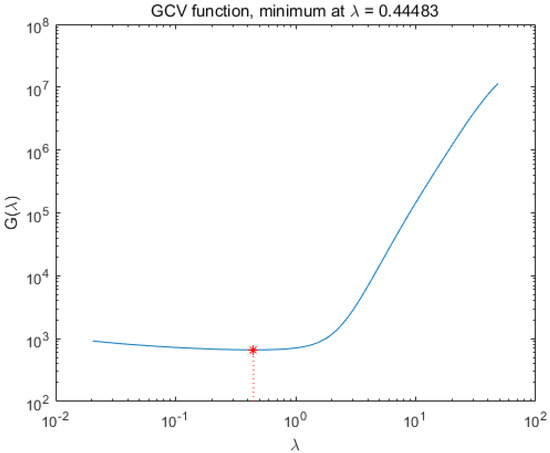 In [31], it is illustrated that the GCV method seeks to balance perturbation and regularization errors. We finally decided to adopt the quasi-optimality criterion for our selection.This method is only defined for a continuous regularization parameter and amounts to minimizing the function.