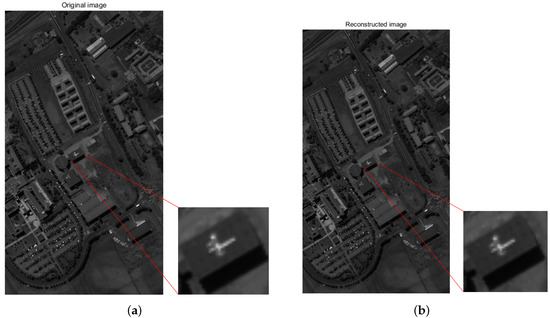 When the modulation function R calibrates the standard deviation to 1%, the algorithm is used to reconstruct the data cube PaviaU for restoration. The spectra of 52 channels were recovered using 98 broadband filters, and one of the single-wavelength images was taken to compare the recovery effect. (a) shows the original single-wavelength image, and (b) shows the recovered single-wavelength image. Local detail images are shown enlarged. (peak signal to noise ratio (PSNR): 40.1974; structural similarity (SSIM): 0.9885).