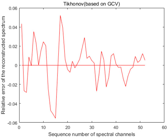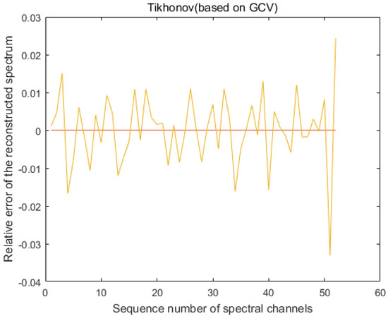 From Figure 4, we can see that when the standard deviation of the modulation function R is 1%, the maximum error of the accuracy of LSQR for spectral reconstruction reaches 400% and the maximum error of the recovery of the spectrum based on the L-curve-based Tikhonov algorithm reaches 28%. However, we use the GCV method to find the regularization parameters of the Tikhonov algorithm. Figure 5 shows that when regularization parameter is 0.44483, the best recovery effect on the spectral recovery is exhibited. The maximum error of the spectral reconstruction effect does not exceed 5%.