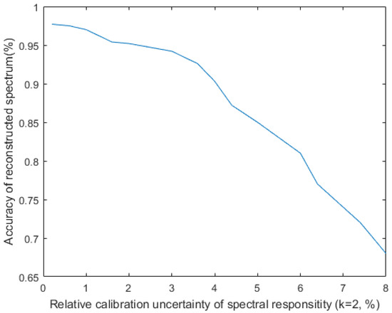 We assigned different standard deviations to the modulation function R.The Monte Carlo method was then used to reconstruct the spectrum (1000 independent experiments) and take the maximum error to draw a curve. The results are shown in Figure 10. We can see that when the error of R is 4%, the spectrum reconstruction accuracy is less than 90%, and when the error of R is less than 2%, the spectrum recovery accuracy is about 95%.