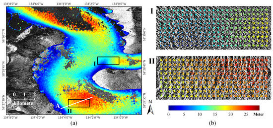 - Taku Glacier is the principal outlet glacier of the Juneau Icefield located in the Coast Mountains of southeast Alaska, as shown in Figure 3a. It is one of the deepest and thickest temperate glaciers known in the world with the maximum thickness measured at 1477 m and the length of the ice shelf approximately reaching 58 km [53]. Taku Glacier is an advancing tidewater glacier characterized by high accumulation rates and very high melt rates at low elevations with a large mass turnover [54]. The behavior of Taku Glacier can greatly reflect the tendency of changes in the Juneau Icefield, possessing significant research value.A pair of TSX images covering the lower Taku Glacier was employed. The image pairs were acquired in strip-map mode from ascending pass direction and have an HH polarization. The imaging dates were 2009.07.11 and 2009.07.22 with one repeat cycle of 11 days apart. The spatial resolution was resampled to 2.09 m × 2.09 m in geometric pre-processing.