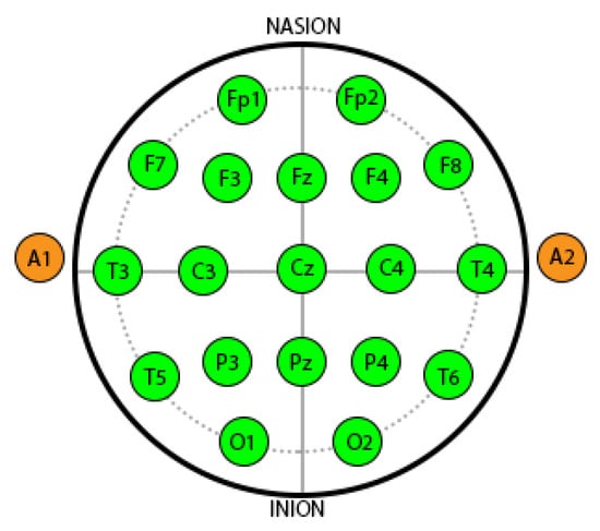 In this study the data for 26 subjects (average age: 22.46 ± 0.79, six females, and four left handed) is used. The selected participants had no previous critical medical history and were free from any neurological abnormalities. They exhibited normal or corrected-to-normal vision. The participants were fasting for at least 2 h before starting the experiment. The EEG recording comprised of two sessions: relaxing and stress periods for 5 min each, which resulted in 260 min of EEG recording for the study resulting in 15,000 windows of 40ms duration for each subject. In total, 19 electrodes were used after selection based on 10-20 montage with an average mastoid reference (labelled as Fp1, Fp2, F3, F4, F7, F8, C3, C4, T3, T4, T5, T6, P3, P4, O1, O2, Fz, Cz, and Pz). Figure 4 shows the different locations of the electrodes.