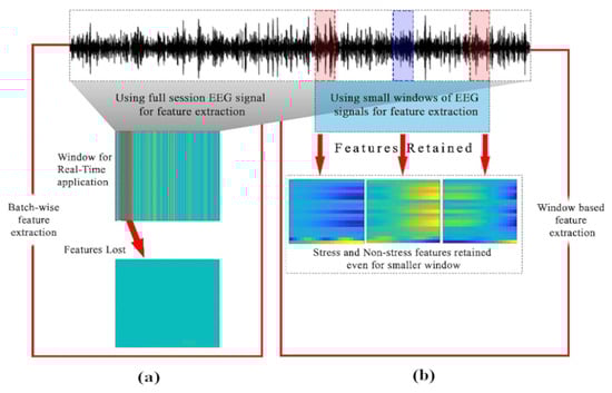 However, the procedure reported in [,] is not suitable for real-time applications owing to the pre-processing of EEG data, large batch sizes of signals, and it included supervised features extraction, which is sensitive; these constraints render it difficult to address stress assessment for real-time applications. The scope of this study is to identify stress in real-time, for that reason in order to make a clear comparison among the existing techniques that address stress level identification from an offline EEG signals and the proposed method, we need to convert existing framework present in literature to make them compatible with the required process flow. The purpose of applying such conversion is the limitation that very few studies are available that address stress assessment in real-time with EEG signals.
