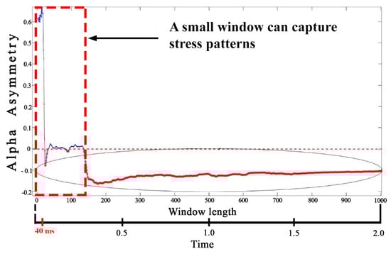 For a real-time application, batch processing of the entire EEG signal data is not suitable. For example, neurofeedback applications require signal evaluation within less than 1 second for content triggering. Hence, feature extracted from the entire data may not represent the stress patterns contained in 40ms window. The advantage of using sliding windows over the batch signal is its compatibility with real-time assessments and prevention of feature loss. To demonstrate the prevention of feature loss, feature extraction is performed on 40ms windows as well as on the entire batch signal. Figure 6 shows that the 40 ms windows retained the features representing the stress patterns. Whereas, the features extracted from the batch data were not suitable while applying on 40ms window for real-time applications. For example one metric for stress assessment is AAS value between channel Fp1 and Fp2 at prefrontal region []. Figure 7 shows that the AAS values (used for labelling) may shift from negative to positive when the length of the signal window is incremented gradually. Moreover, the window size of 40ms results in an optimal value of AAS showing that the stress and non-stress patterns are not lost. This shows that the stress patterns can be shadowed by non-stress patterns if a longer window is considered.