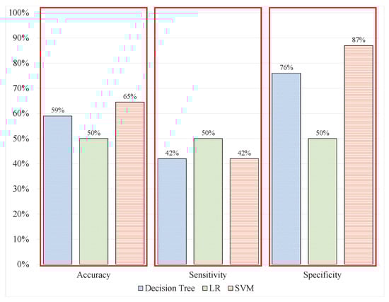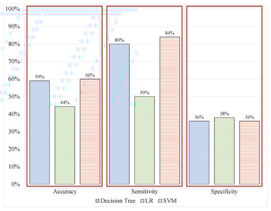 To investigate the factors that can be improved to achieve a real-time assessment, the procedure was modified with different aspects to obtain the most optimised process. The EEG signals in [] were processed using automatic cleaning techniques as well as manually removing noise and artefacts; therefore, they would not be compatible with real-time applications. In experiment 1, the same features from the same signal window size and labels were classified. The SVM, DT, and LR were used to classify the signal patterns. The DT produced classification results with 59.20%, 42%, and 76% accuracy, sensitivity, and specificity respectively; meanwhile, LR produced 50%, 50%, and 50% correspondingly, whereas SVM produced the most promising results in experiment 1 with 64.50%, 42%, and 87% accuracy, sensitivity, and specificity, respectively. Table 2 and Figure 8 demonstrate these results with a visualization showing that with uncleaned signal in batch data, the models could not perform correct classifications because the results deteriorated compared with the benchmark results from [] that are 79.54% accuracy, 81% sensitivity and 78% specificity.