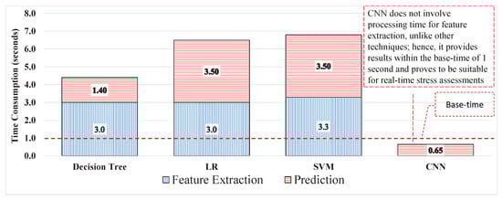 The supervised feature extraction process must be replaced with other processes that are compatible with the real-time stress assessment system. The CNN in experiment 4 replaces the supervised feature extraction with an unsupervised extraction of features from the sliding windows with AAS labels. Throughout the experiments, the dataset was consistent; as such, the comparison should not be biased. After the training of the CNN model, it predicted the testing data, the same as in previous experiments. The classification performance of the CNN was 96% accuracy, 95% sensitivity, and 97% specificity with the time response for 1 s signal windows of 0.65 s. The model performed significantly better than all previous techniques discussed and performed all the processes in the minimum amount of time, thereby avoiding an exponential increase in the signal wait time, which occurred in the ML approach the performance is highlighted in Table 4 and the time response in Figure 10.