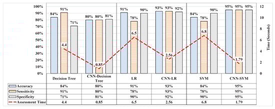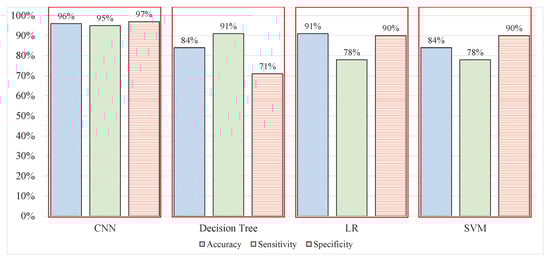 The CNN must be validated to demonstrate that the features extracted are efficient. The features from the CNN were collected and used in the ML technique, i.e., DT, LR, and SVM. The classification results proved that the features from the CNN improved the performance capability of these ML techniques. The DT yielded 80.6%, 81%, and 80% accuracy, sensitivity, and specificity, respectively which shows decrement in case of accuracy as compared to the results produced by DT showed in Figure 11, but the model with supervised features is overfitting as the specificity is just 71% whereas with features from CNN made the model more robust. The performance of LR improved to 92.7% in terms of accuracy, with 93% sensitivity and 92.7% specificity. The SVM improved by 10% in terms of accuracy and yielded a total accuracy of 95% with sensitivity and specificity of 95% each, which was similar to the accuracy of the CNN, as demonstrated in Figure 12. The experimental results demonstrated that efficient features affected the performance of learning, and that the models performed well. When using ML techniques, domain experts performed feature extraction; however, after extraction, optimum features were selected during feature selection to ensure the good performance of the models.
