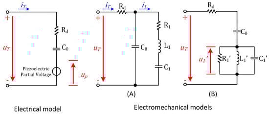 In the electromechanical models, the dielectric property is characterized by and . For model A, which is similar to the classic Butterworth-Van Dyke (BVD) model [,], the series , and characterize the modal damping, mass and stiffness, respectively. Under the steady state of sinusoidal excitation, the model A can be converted to the model B []. In this model, the parameters can be calculated by