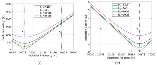 Therefore, the variations in and under different excitation frequencies are calculated and demonstrated in Figure 2a,b, respectively, in which is taken as four different typical values of 7.4, 50, 100 and 200 Ω. This analysis shows that increases linearly while increases slightly at as increases. Therefore, it can be inferred that the wide range of loads leads to an equal variation range of at . Furthermore, the current variation range is further expanded to over a hundred times when the vibration amplitude is controlled from 20% to 100% in our system.