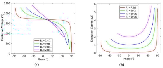 Further, we perform Fourier transform to extract the fundamental wave of , and the actual is calculated and demonstrated in Figure 14. This result shows that the phase difference is about 15°~25° under most operating conditions but relatively large under no load conditions ( equals to 7.40 Ω). It is inferred that the load optimization frequency is slightly lower than with near 20° in Section 2.2. The experiment result verifies this inference in which the actual excitation peak voltage is 1.76, 1.58, 1.58 and 1.62 kV when equals to 7.40, 50, 100 and 200 Ω, respectively.
