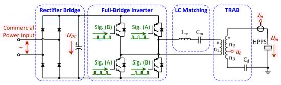 The commercial power (220 V 50 Hz) is rectified into the DC power , and then inverted to the AC power in ultrasonic frequency. A series LC matching circuit is used for DC isolating and harmonic filtering. More importantly, the specific configuration of and is also related to impedance matching and vibration excitation, which are analyzed in the next sector. Since a transformer ratio arm bridge (TRAB) is easy to be intergraded with little impact on the electrical circuit [], it is adopted to detect the partial voltage online. A tap is drawn from the secondary side of the transformer with the coil turns satisfying , and a detection capacitor is connected into the circuit, which satisfies