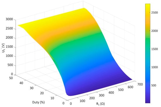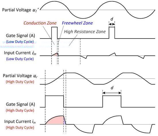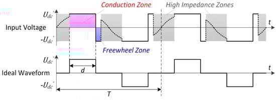 For the conditions where the inverter is driven with high duty cycle , the capacitor voltage is considerable, leading to Equations (21) and (22) in the conduction zones and freewheel zones, respectively. This mechanism leads to the heaping of the current waveform, as shown in Figure 6, which greatly increases the excitation current to the HPPS. Although it is difficult to analyze the current waveform further, the behavior of the inverter can be analyzed from the perspective of the input voltage under these situations. The conduction zones gradually dominate in the waveform of , approaching to a bidirectional pulse wave with increasing , as shown in Figure 8.
