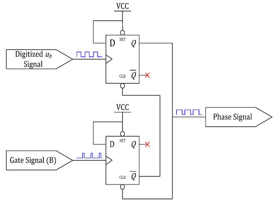 In this scheme, a pulse-based phase detector (PBPD) is proposed. Since the input current almost occurs in the conduction zones, a PWM gate signal is used instead of the . A classical digital phase detector based on D flip-flops is adopted to generate a phase detection signal. The timing diagram of the relevant signals and the phase detector circuit are shown in Figure 10 and Figure 11, respectively.