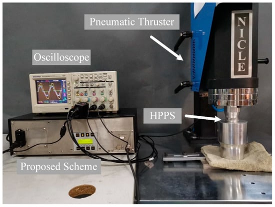 This paper demonstrates that the proposed scheme is capable of frequency tracking and vibration control under a wide operating range. First, the impedance analysis indicates that the excitation current varies in a wide range under different loads near . The analysis also indicates that a slight deviation in phase affects the impedance characteristics little. Especially, we suggest that the load optimization frequency with about 20° phase difference can help avoid the excessive rise up of the excitation voltage under high load conditions. Second, the electrical architecture is built, and the drive capability of the scheme is verified in wide range of loads and different vibration amplitudes. Then, the pulse-based phase detector (PBPD) is proposed, which can get the phase signal over a wide operating range with acceptable precision. The experiments verify the feasibility of PBPD and vibration amplitude control under the resistance range from 7.40 to 500 Ω and the vibration range from 20% to 100%. Finally, the experiment verifies that the accuracy of the vibration control is within 2% via a laser displacement sensor under varying load. The proposed scheme could be very useful for the HPPSs working in complex conditions, like ultrasonic welding and cutting.