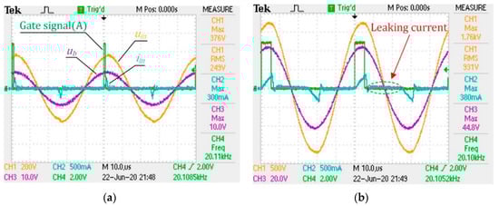 In most ultrasonic systems, piezoelectric transducers (PTs) need to be excited in the resonant mode [,]. Besides, different vibration amplitudes are required for different processing materials [,]. For the PT working at light loading conditions, the excitation voltage and current are almost in phase at and , while the impedance reaches the minimum and maximum near and , respectively []. Therefore, the working frequency can be tracked by a phase locking loop (PLL) or impedance extremum search []. Meanwhile, the vibration amplitude can be controlled through current and voltage driving modes at and , respectively [,]. However, as the load increases, two pairs of zero phase frequencies and the impedance extreme frequencies gradually deviate from and []. In order to enlarge the operating load range, schemes based on the impedance or admittance calculation are proposed, such as the maximum target impedance scheme and the admittance circle tracking scheme [,]. However, these schemes require complicated software operations to calculate the frequency deviation and the vibration amplitude. With the aid of a transformer ratio arm bridge (TRAB), a vibration amplitude signal is obtained online in an ultrasonic motor control scheme under different operating conditions []. Moreover, this signal is in phase with the excitation current at , so the parallel resonance detection can be achieved by detecting the phase between the vibration and the excitation current signals. However, the excitation current can be extremely discontinuous and harmonic-rich in the HPPSs over a wide operating range, leading to a new challenge for phase detection.