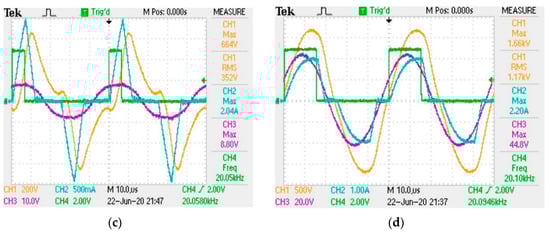 The experimental setup is demonstrated in Figure 12. Here, the HPPS is fixed on a pneumatic thruster and pressed against a damp cloth. We apply different loads to the HPPS by adjusting the cylinder pressure of the thruster. Meanwhile, the waveforms of , , and the gate signal A are measured by a Tektronix TDS 2024B oscilloscope, and the waveforms of four extreme operating conditions are shown in Figure 13. Here, 100% controlled vibration amplitude corresponds to about 1700 V of . The sampling period of the oscilloscope is 0.04 μs in the experiments, and the accuracy is 0.04 per division for each channel. This result shows that the center of the pulse coincides with the peak of , indicating that the frequency tracking meets the design. Meanwhile, the current waveforms are basically consistent with the analysis. The difference is caused by a weak leaking current in the high-resistance region, which may be attributed to the influence of the parasitic capacitance of the IGBT modules in the inverter.