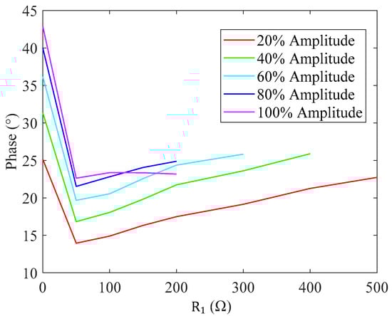 Due to the analyzed above, we configure and . Here, we use MATLAB/Simulink (MathWorks, Natick, MA, USA, 2017b) to simulate the relationship among , and , as shown in Figure 9. It shows that increases smoothly with under different loads. This result verifies the drive capability of our scheme under a wide range of loads with adjustable vibration amplitude.