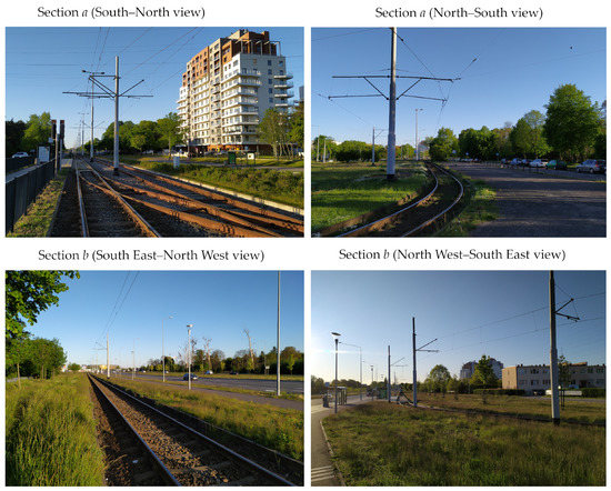 - Section of a length of about 330 m. One-track tramway route located asymmetrically on the south side of an access one-lane road. It is characterized by the appearance of very extensive field screens (tall buildings adjacent to the track) and the good condition of the track. It was chosen to assess the impact of field screens on the possibility of the reconstruction of a typical geometric system of the track (see Figure 3)