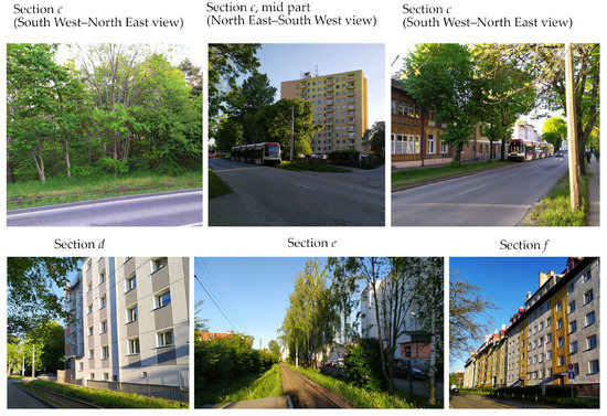 - Section of a length of about 400 m. One-track tramway route is located asymmetrically on the north side of a four-lane avenue. The fragment is characterized by a small number of field screens (single trees near the track), and a very good technical condition of the track’s structure. This section was also chosen as a reference section.