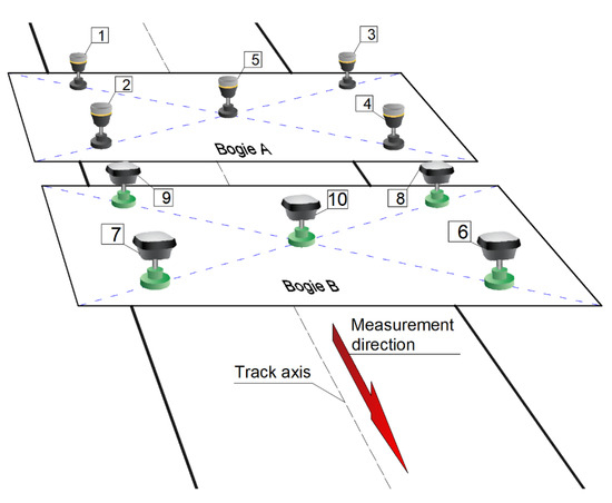 As measurement cars, the bogies of the GWF 300 car series were adopted. They are characterized by favorable conditions for matching their ride axes into the track axis (no extensive amortization, no clearances) and a relatively low height of the measurement deck. On each of both bogies, five receivers were installed in a rectangular formation. In the centers of both bogies, directly above the bogie’s pivot, central antennas were placed. A diagram of the layout of the receivers is shown in Figure 4.