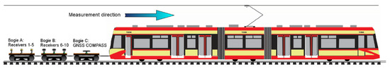 The vehicle that met the above-mentioned requirements proved to be a Bombardier NGT-6/2. Finally, three measurement bogies were attached to the engine car. On the first bogie (the closest to tramway) the devices recording additional parameters of a run (such as acceleration, inclination and direction of the run) were installed. On the other two, a set of 10 GNSS receivers were placed. To avoid a negative influence from naturally occurring obstacles, i.e., tramway cabs, an additional bogie was located between the tramway and the bogies with GNSS antennas. A diagram of the measuring train is shown in Figure 5.