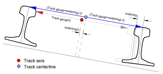 The axis of the railway or tramway track physically does not have any representation. Considering a typical cross-section of a track, its axis is located at a point distant by a length of half the width (track gauge) between the rail courses at a height of the line connecting running surfaces of rail heads. In general, the axis of the track does not have to coincide with the central axis (so-called centerline) of a railway track. This is the case in curves with small radii, in which a widening of the track is often made. Figure 8 shows the definition of the axis of a railway track and its centerline.