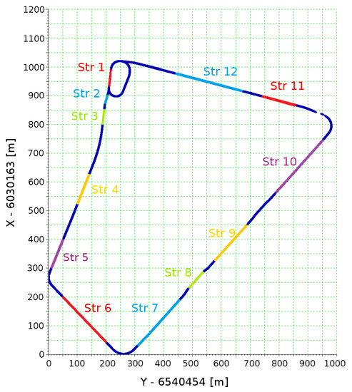 Among the sections identified by the algorithm as straight sections, a, b and c were selected for further analysis of eight straight of sections. Figure 17 shows the final selected straights and straights selected initially (on the basis of a visual evaluation of the measurement data). To distinguish the straight lines from the earlier selected sections (Figure 9), for the first ones Str’ markings were introduced.