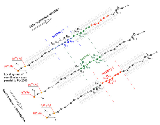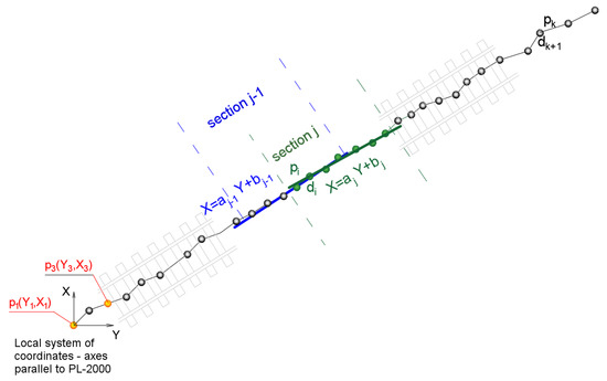 where: —parameters of linear model in section , and —coordinates of measurement points in the local system with directions in accordance with the PL-2000.