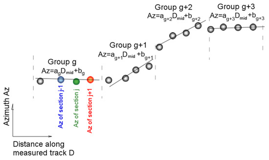 (2) With estimators of the direction in the individual sections of the route, variation of this direction is analyzed in the passages from one interval to another, i.e., in the series of consecutive sections. It is assumed that the angle representing the direction in each section maps the variation of the shape of the axis of the route analyzed. On the straight sections, a slight oscillation of the estimator value is expected, and in the areas of curves beside the oscillation a clear increasing trend of this value should appear. In order to examine these trends, the algorithm groups the adjacent sections with one another (of which each has a calculated estimator of direction in the previous step) in a minimum number and carries out the next analysis on the sets thus designated. The number of sections in each group depends on the geometric system (length of homogeneous sections of the route) and is determined by the analysis of Pearson’s correlation coefficient. This time, the analysis of regression concerns the values of the angles of individual sections. If we assume the angle as azimuth () then the analysis of the grouped regressions of section can be written as follows: