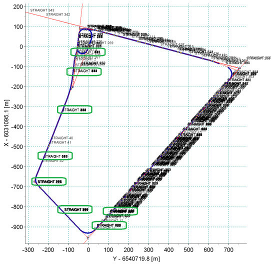 Then, the analysis of the resulting measurement signal was made, according to the algorithm shown in Section 2.4. For input data in the form of the measurement signal recorded by two receivers (with a frequency of 20 Hz) during the six passages of the route, the algorithm detected the presence of 536 straight sections, giving an average of about 45 straight sections making up the whole geometrical system. Figure 14, Figure 15 and Figure 16 show the calculation results of the algorithm. They represent scalable windows of a program for data analysis, implemented in a Scilab environment. The automatically developed computer program defined the beginnings and ends of the straight sections, and in half the reconstructed section a label with the next number of section was pasted. Since the algorithm operated simultaneously on all 12 measuring signals, these fragments, which a number of straight lines overlap, can be treated—as the way of visual assessment of the result in the graph—as repeatedly reconstructed. If the numbers of straight lines are offset with respect to one another, it means that the algorithm was not able to reconstruct the beginnings and ends of straight or divided sections into shorter ones at a high level of repeatability, or indicated that the straight lines as false positive, recognizing, for example, the distortion of a signal or inequality of a track in a straight section as a curvilinear section.