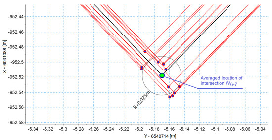 The values in Table 1 and Table 2 clearly show that Section 5 and the associated vertex W5–6 were reproduced with the highest uncertainty. Section 5 is a straight insert between the crossover needle (the measurement train moved in the reverse crossover direction) and the curve behind the crossover. This section is very short, and the intersection angle at this point is very small (less than 1 degree). The measurement on such a short section is burdened with considerable uncertainty to designate its direction, and also coordinates of vertices W4–5 and W5–6. Additionally, the vertices analyzed featured by a very small intersection angle, comparable to the value with the uncertainty to determine the angle. The coincidence of a short length of Section 5 and the small intersection angle in vertex W5–6 generated a very high level of uncertainty (mean value of error and standard deviation at 1.3 m). However, this was not the result of an incorrectly accepted measurement technique, but of geometric relationships in the measured geometric system. The coordinates of vertices with the favorable system of tangents were determined with very high reproducibility.