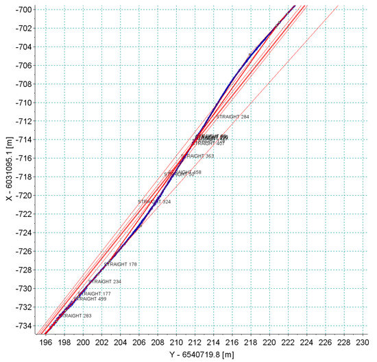 The selected straights located in the designated sections of the tramway terminus were analyzed. Figure 9 shows the location of individual straights in the form of coordinates on the grid of the PL-2000 system in force in Poland (Gauss–Krüger projection for Geodetic Reference System ‘80). These straights were separated from GNSS measurement data based on the visual assessment of the results. Table 1 shows the signatures of straight lines in the corresponding sections of the tested track. Data in the form of coordinates and additional information, such as the accuracy recorded by the particular receiver as well as the number of satellites used to calculate the position at a given moment of time, were used in the analysis. Table 2 shows an example of the scope of measurement data.