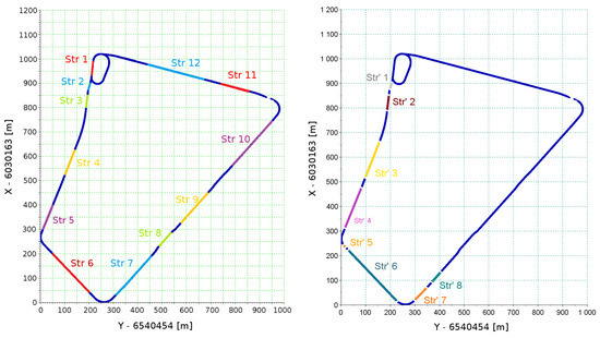 Comparing both sets of straight lines, it can be concluded that there was a large convergence of both methods. There were significant differences in the division of Str 6 to Str’ 5 and Str’ 6 and division of Str 7 to Str’ 7 and Str’ 8. It is worth noting that the reconstructions of straight sections of relatively short length and the longest ones were different. In addition, existing GNSS measurement uncertainties affect the repeatability of the reconstruction of very short sections. However, the uncertainty of designating the angle in the case of short sections will cause small deviations of the model course of the straights with respect to the actual course. However, in the case of long sections, even a small error in the designation of angle can have a significant effect on the results obtained at the ends of the reproduced geometric layout. That is why the indicator taking into account the length of a section was introduced. This indicator, designated as , is the standard deviation of the reconstructed azimuth multiplied by the length of section. The obtained parameters of the sections examined are shown in Table 3 and Table 4.