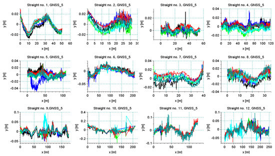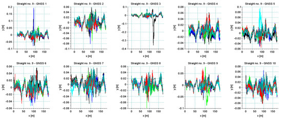 All originally selected straight sections were analyzed. The existence of numerous unfavorable deformations of the track and the field conditions for GNSS measurement should appear in the analysis of signal reproducibility. Figure 18 shows the results of all measurement series—for each straight section—recorded by one of the antennas positioned on the pivot (receiver 5). In most cases, a very good repeatability of the trajectory of this device was observed. It is clear that in cases of bends on the straight lines all runs recorded the same qualitative character of deformation. This observation makes it possible to trim signals so that they do not distort the precision assessment. Of course, cutting out only the deformed parts from the straight line disturbs the actual direction of the straight line; however, to assess the accuracy of the measurement itself such an operation is necessary. Figure 19 shows the results recorded by all receivers during the measurements of section Str 9. This section features the poor track conditions. Numerous irregularities and deformations caused the occurrence of vibrations on the measurement vehicle. Graphs of recorded signals indicated a large number of bends (deformations) along the section of this track. This is one of the sections where the algorithm of the detection of main directions selected a series of short straights. The signals recorded by all receivers revealed the same deformation of the track.