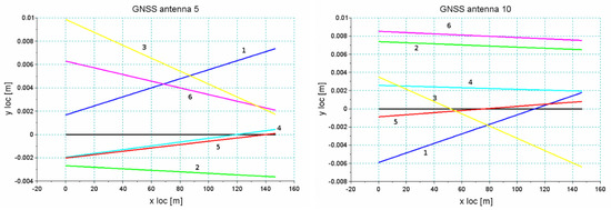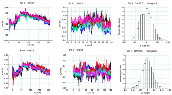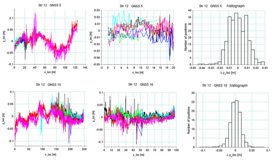 Figure 20 and Figure 21 show the results of the analysis of the reproducibility of the data recorded by receivers 5 and 10 for sections Str 12 and Str 6. As seen in Table 1, these sections were characterized by a very unfavorable environment in the form of buildings and trees. This resulted in a discontinuity in data recording during part of the particular run. The analysis was done for a short segment that was recorded during all six crossings. As regards the accuracy in the reconstruction of direction, the standard deviation was at a level of 1–2 cm, depending on the recorded segment of a particular section, but reliability of measurement under these conditions was relatively low—every crossing showed disturbances of signal loss by different receivers.