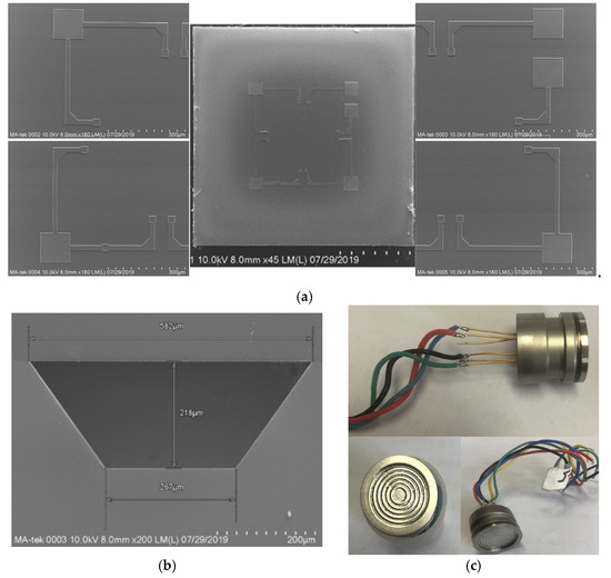(a) Top view of the chip; (b) Cut view of the chip; (c) Packaged pressure sensor.