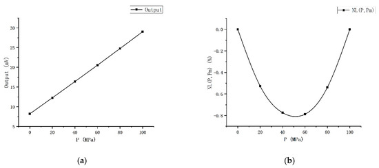 Due to the limitation of the test equipment and method, the test was conducted only within the range of 0–100 MPa, and the test results at room temperature are shown in Figure 4. Under the excitation of 1 mA constant current source, the zero-pressure output is 8.225 mV, and the output voltage is 29.4 mV when the pressure is 100 MPa. The sensitivity is 0.141 mV/(V MPa). The pressure sensor designed and fabricated by Jiang et al. has a range of 0–100 MPa, an output of 109 mV under the excitation of a 5 V constant voltage source, and a sensitivity of 0.22 mV/(V·MPa) [18]. Both sensors have a similar range and sensitivity. NL (P, Pm) in Figure 4b represents the degree of nonlinearity,