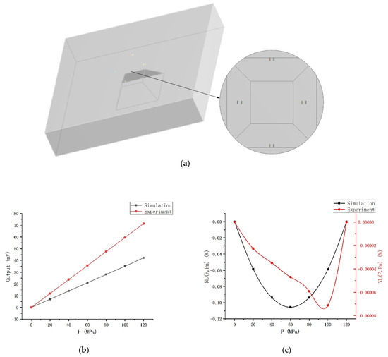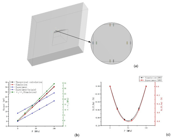 ANSYS is used to set up the finite element analysis simulation. We build the same model as the experiment, and set the equivalent input voltage and the same applying pressure for simulation. In the simulation, the piezoresistive coefficients are π11 = 6.5, π12 = −1.1, π44 = 138.1 (10−7cm2/N), and the corresponding resistivity is 0.078 Ω·cm. The simulation model and resistors arrangement are shown in Figure 5a. The comparison between the simulation results and the experiment is shown in Figure 5b,c. The “Theoretical calculation” curve in the figure is calculated according to Formula (1) and the stress simulation result (“σl-σt” curve in Figure 5b). We draw the “Experiment (origin)” curve by translating the “Experiment” output curve to the origin.