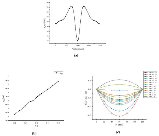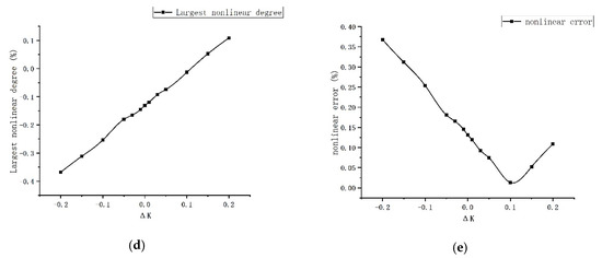 Figure 7a is the stress simulation result of different positions on the diaphragm. Figure 7b–d show the simulation results when RL’s stress position changes. The largest nonlinear degree usually occurs at P = Pm/2, but when it is extremely small, the corresponding P will change. When ΔK increases, the largest nonlinear degree increases from negative to positive, so the nonlinear error reduces to about 0 and then increases.