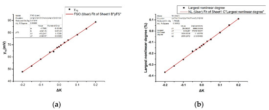 The Adj. R-Square in the two fitting results are 0.99866 and 0.99902 respectively, indicating that the simulation results are almost consistent with the theoretical calculation. The full-scale output increases with increasing ΔK because RL has moved to an area where the stress changes greater. So, the pressure sensor sensitivity increases. The nonlinearity of the device is compensated at the circuit level due to the difference in resistance caused by the different RL and RT stress positions, so the nonlinearity is optimized. In addition, the nonlinear error is the maximum absolute value in the calculation results of all test points, so it can be close to but not equal to 0. Only when the nonlinear error is extremely small, the corresponding P is not Pm/2, so Equations (15) and (16) can still be used to estimate the difference in the stress at the piezoresistors locations to get optimal linearity.