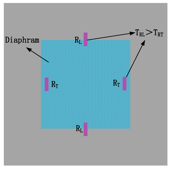where π1, π2, and π3 are the first-order, second-order, and third-order piezoresistive coefficients, respectively, and T is stress. Our research group has studied the method of an asymmetric Wheatstone bridge to optimize nonlinearity [21], and we found that when the resistance of RL (the resistor perpendicular to the near side) is greater than RT (the resistor parallel to the near side), the nonlinear error will first decrease to around 0 and then increase, so when RL > RT and the difference is within a certain range, the linearity of the device can be improved, but additional zero output will be generated, which is not expected. On the other hand, when the diaphragm is pressed, RL increases and RT decreases, and the rate of change is related to the change of the stress at the resistor’s positions. The sensor diaphragm satisfies the small deflection theory, so the stress and pressure show a good linear relationship [16,17], assumed that,