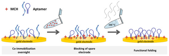 Schematic illustration of biosensor preparation. Co-immobilization step overnight, mercaptohexanol (MCH) blocking, and boiling step.
