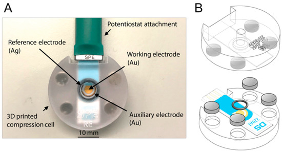 For performing biosensing experiments with SPEs, a static cell was designed and 3D printed. It consisted of two parts—a bottom and a top part. Both parts held a slot specifically adapted to the dimensions of the SPE that was providing the necessary support and ensured a firm fit in the static flow cell. The top part included a cavity, focusing the corresponding electrodes of the SPE, which enabled the exposure of electrodes to a defined volume of liquid, such as buffer solutions or bacteria samples. During the biosensing experiment, the top part of the static flow cell has to be exchanged. Only the working electrode should be functionalized with aptamers, whereas for electrochemical measurements all electrodes have to be in contact with the respective buffer solution. Therefore, two exchangeable top parts were designed—one enclosing only the working electrode of the SPE and one enclosing all electrodes. Changing the top parts required easy (dis)assembly while holding sufficient sealing at the same time. This was guaranteed by magnets and an O-ring, which was perfectly enclosing the corresponding electrodes (see Figure 2).