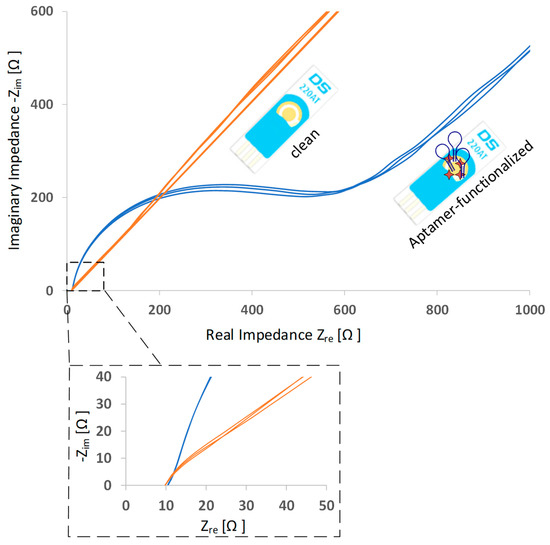 To verify the successful aptamer immobilization on the working electrode, EIS measurements were conducted. Impedance is a mathematically complex value that consists of a real and an imaginary part. A common presentation of the data is to plot the real and imaginary parts against each other (Nyquist plot). Each point on the plot presents the impedance parts at one frequency. A comparison of Nyquist plots before and after aptamer functionalization is shown in Figure 3. A significant increase in impedance can be observed after aptamer is immobilized. Due to the immobilized oligonucleotides on the gold surface, the electron transfer is hindered and impedance increases.