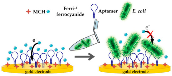 Electrochemical measurements, such as electrochemical impedance spectroscopy, offer label-free, rapid, and sensitive detection—a real benefit towards point-of-care testing. For instance, detection limits close to single-molecule detection have been reported (lipopolysaccharide concentration of 0.01 attomolar) [8]. Herein, we focused on impedimetric aptamer sensors. Previously reported targets include: Small molecules like progesterone [9] or Ochratoxin A (OTA) [10], proteins such as clinically relevant Vascular Endothelial Growth Factor (VEGF) [11,12] or carcinoembryonic antigen (CEA) [13], spore simulants of Bacillus anthracis [14], and various bacterial pathogens (e.g., Salmonella typhimurium [15,16], Escherichia coli (E. coli) [17,18,19,20], Staphylococcus aureus [21,22]). Infections with specific pathogenic E. coli, for instance, are the cause of multiple severe medical conditions [23]. Thus, rapid and reliable testing is needed to validate the safety of food or environmental samples. However, this presents only one example of why rapid detection methods are needed. Traditional methods based on bacterial culturing are laborious and take days, while specific amplification (e.g., polymerase chain reaction-based detection) needs only a few hours but does not differentiate between dead and living cells and requires costly devices and reagents. In comparison, electrochemical methods offer rapid and sensitive testing. Combined with aptamers as biorecognition element, the binding of whole cells enables selective detection of bacteria with no or little sample preprocessing. Besides electrochemical biosensors with antibodies and other biorecognition elements [24] with detection limits down to single-digit CFU (colony-forming units) mL−1, also a few electrochemical aptamer-based biosensors have been reported for the detection of E. coli [25,26,27]. However, they all have in common that electrodes are either self-made or custom-made, which hampers simple and open-access transfer to in-field applications, due to a lack of standardization of the electrode setup.