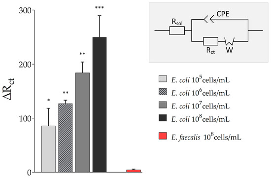 Results of biosensing experiments. Electrochemical Impedance Spectroscopy (EIS) measurements of biosensor experiments with varying Escherichia coli Crooks and Enterococcus faecalis (E. faecalis) concentrations were fitted to the modified Randles circuit with Rsol: solution resistance, Rct: charge-transfer resistance, W: Warburg impedance, and CPE: constant phase element. Extracted charge transfer resistance ∆Rct is displayed. All experiments were repeated several times in independent experiments (technical replicates, n = 3) and significant differences to Enterococcus faecalis as a control are indicated: * p < 0.05, ** p < 0.01, *** p < 0.001.